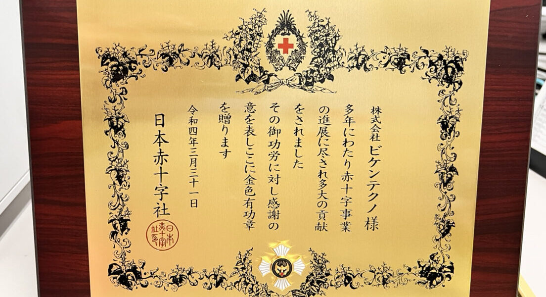 この度、多年にわたり赤十字事業の進展に尽くし、多大に貢献したとして日本赤十字社より感謝と共に金色有功章が贈呈されました。