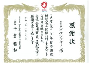 2025年日本国際博覧会協会より、2025年日本国際万博博覧会の開催への協力に対して感謝状を頂きました。